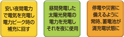 太陽光発電で使い切れない電力や夜間の割安な電力を蓄電し、効率よい電力利用を実現。注目の商材です。